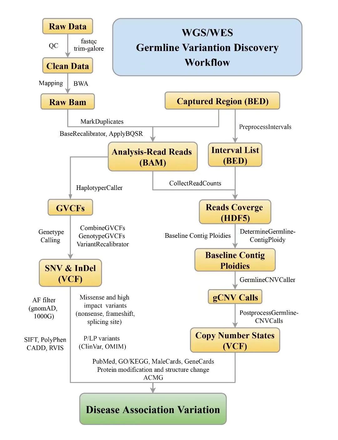 包含从下机数据质控,公共数据准备,基因组比对,到变异检测,过滤和有害性预测等全流程。