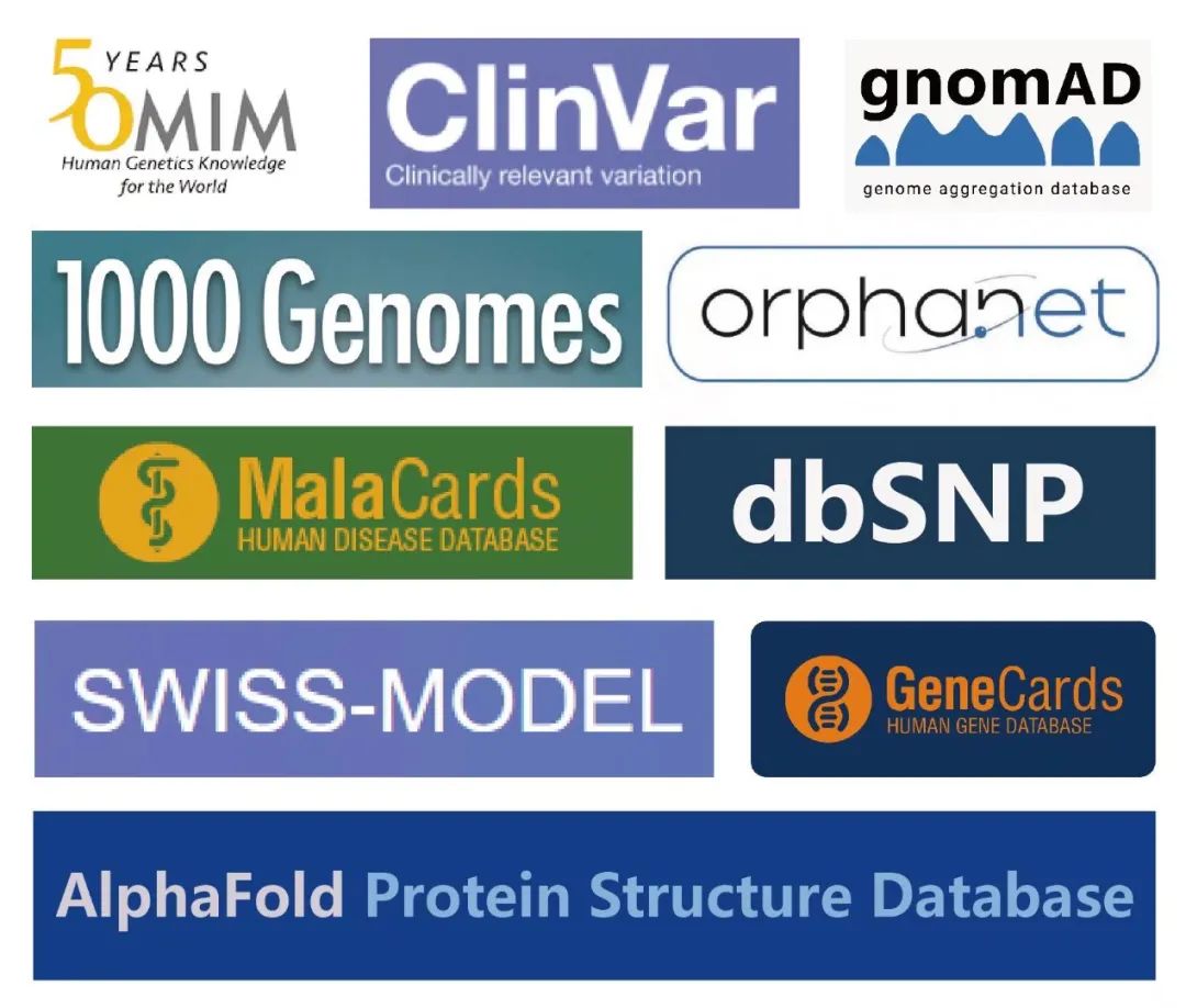 数据库详解 (OMIM, ClinVar, 1000G, ExAC/gnomAD, MalaCards/GeneCards, SWISS-MODEL/AlphaFold);