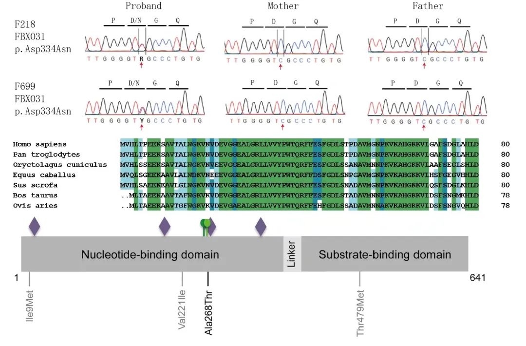 Sanger测序拼接和峰图,多序列比对结果图,蛋白结构域及翻译后修饰模式图,突变蛋白的三维结构图
