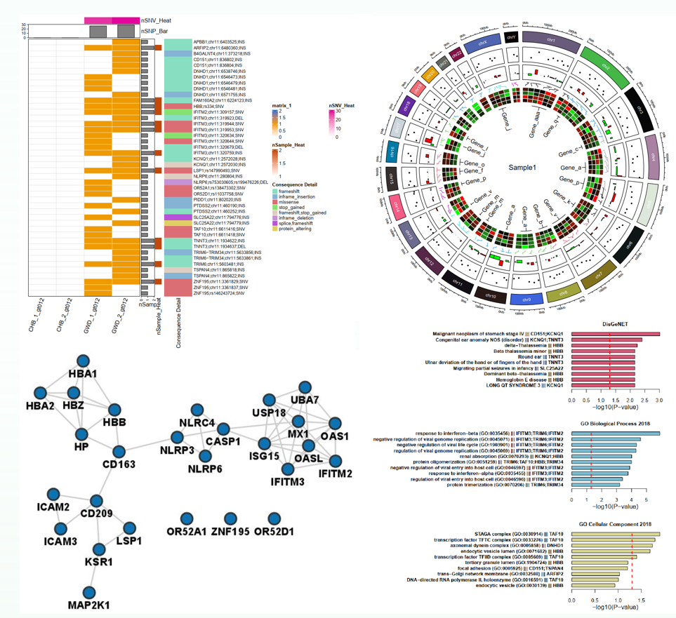 | 24 | 变异统计与绘图 | GO/KEGG/Reactome通路富集, OMIM Disease, DisGeNET, ClinVar和Human Phenotype Ontology疾病或表型富集, 蛋白组织特异性表达富集, PPI网络, 变异热图, Circles图绘制 |