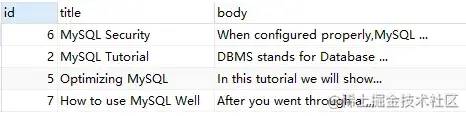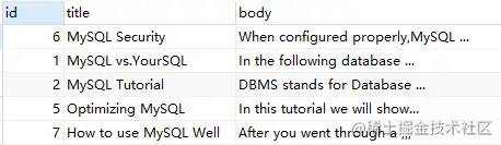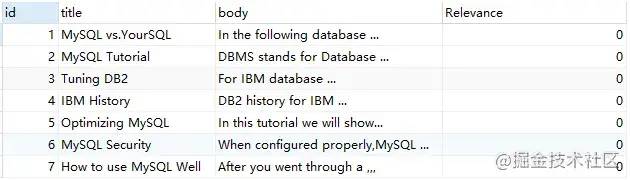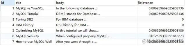 SELECT*,MATCH ( title, body ) against ( 'MySQL' ) AS RelevanceFROMfts_articles;