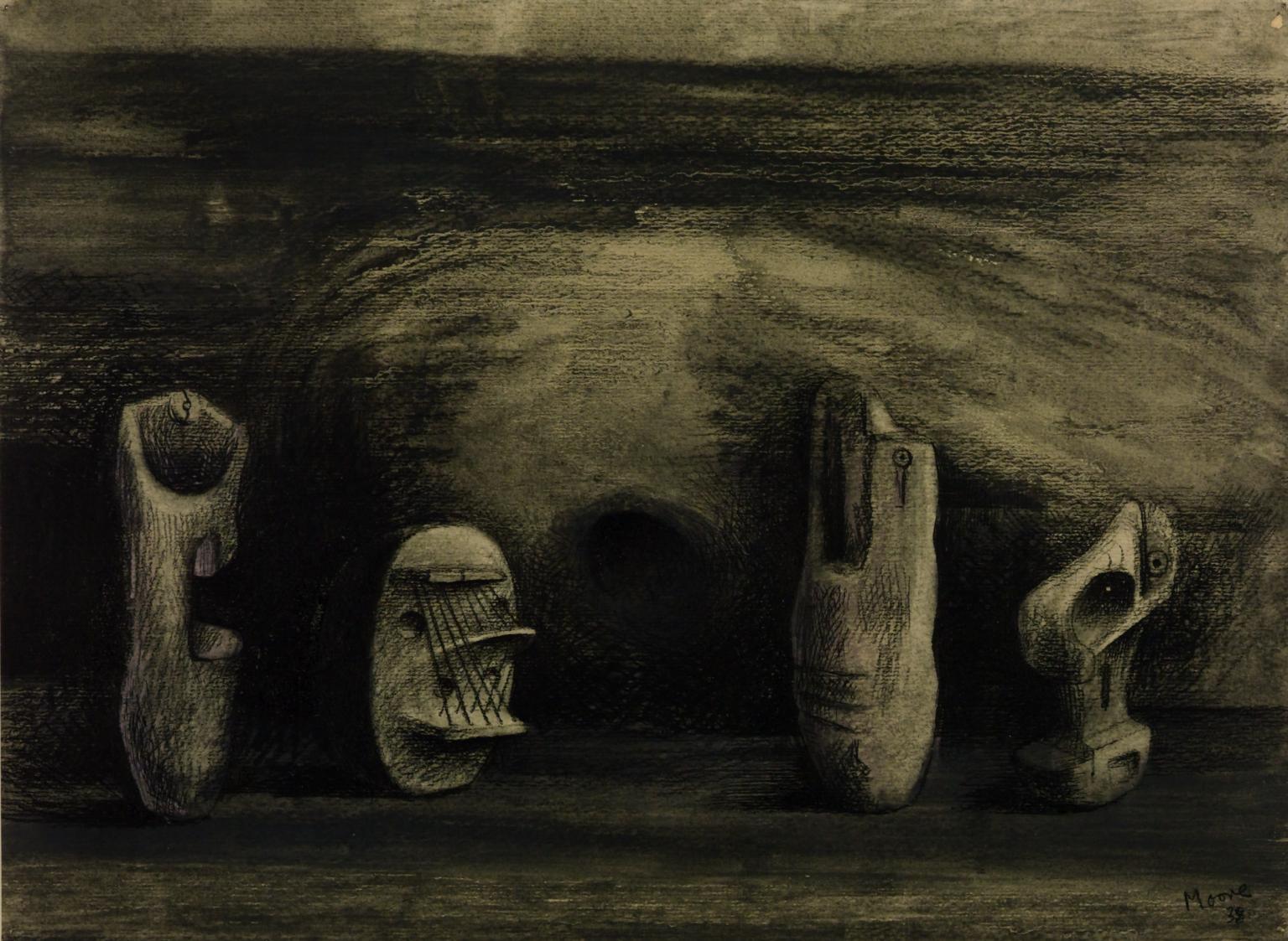 T00271 FOUR FORMS, DRAWING FOR SCULPTURE 1938 Inscr. ‘Moore 38’ b.r. Chalk, wash and indian ink, 11×15 (28×38). Purchased from the Executors of the late E. C. Gregory (Grant-in-Aid) 1959. Coll: E. McKnight Kauffer, February 1939; E. C. Gregory. Exh: Mayor Gallery, February 1939 (6); Temple Newsam, Leeds, July–August 1941 (64); New York, Chicago and San Francisco, 1946–7 (68, repr. p.50); British Council tour, Australia, 1947–8 (23); British Council, Brussels, Paris, Amsterdam, Hamburg, Düsseldorf and Berne, 1949–50 (64); The Meaning of Sculpture , Cape Town, 1952 (Part 2, No.56); The Modern Movement in British Water-Colour Painting , Norwich, December 1957–February 1958 (53). Lit: Neumann, 1959, p.70, repr. pl.41. Repr: Sweeney, 1946, p.50; Read and Sylvester, I, 1957, p.206. This is one of a number of drawings of sculptural forms in landscape settings made 1937–8. Writing in 1937 Henry Moore stated: ‘My drawings are done mainly as a help towards making sculpture - as a means of generating ideas for sculpture, tapping oneself for the original idea; and as a way of sorting out ideas and developing them’ ( Listener , 18 August 1937; reprinted in Read and Sylvester, op. cit. , p.xxxv). The form second from the left is identical with the small elm wood and string ‘Head’ of 1938 in the possession of Ernö Goldfinger (Read and Sylvester, op. cit. , p.12, No.188, repr. p.126; also repr. Neumann, 1959, pl.40); the other forms are related less closely to other sculptures of the same period. Published in: Mary Chamot, Dennis Farr and Martin Butlin, The Modern British Paintings, Drawings and Sculpture , London 1964, II