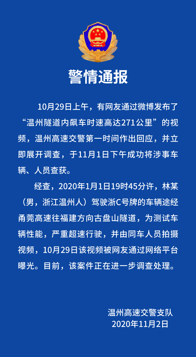 10月29日上午,有网友通过微博发布了“温州隧道内飙车时速高达271公里”的视频,温州高速交警第一时间作出回应,并立即展开调查,于11月1日下午成功将涉事车辆、人员查获。