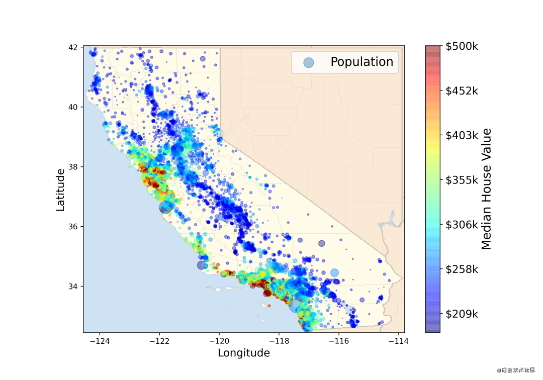 我们以美国加州房价数据为例,导入加州房价数据绘制散点图,同时导入加州地图图片,查看地图经纬度对应房价的数据。同时使用颜色栏,绘制热度图像。