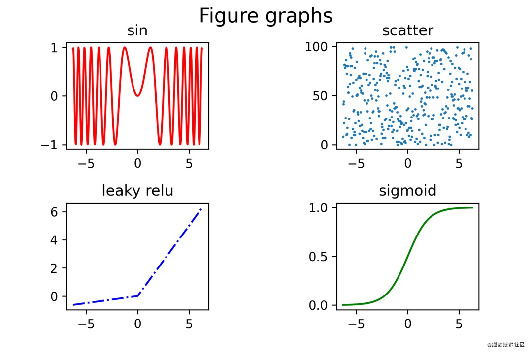 其中,最关键的是subplots方法,生成2行2列的子图像,然后我们调用ax_list中的各绘图方法。其中'r-','b-.'参数为绘图的缩写写法,本文后续参数缩写段落会单独讲解。