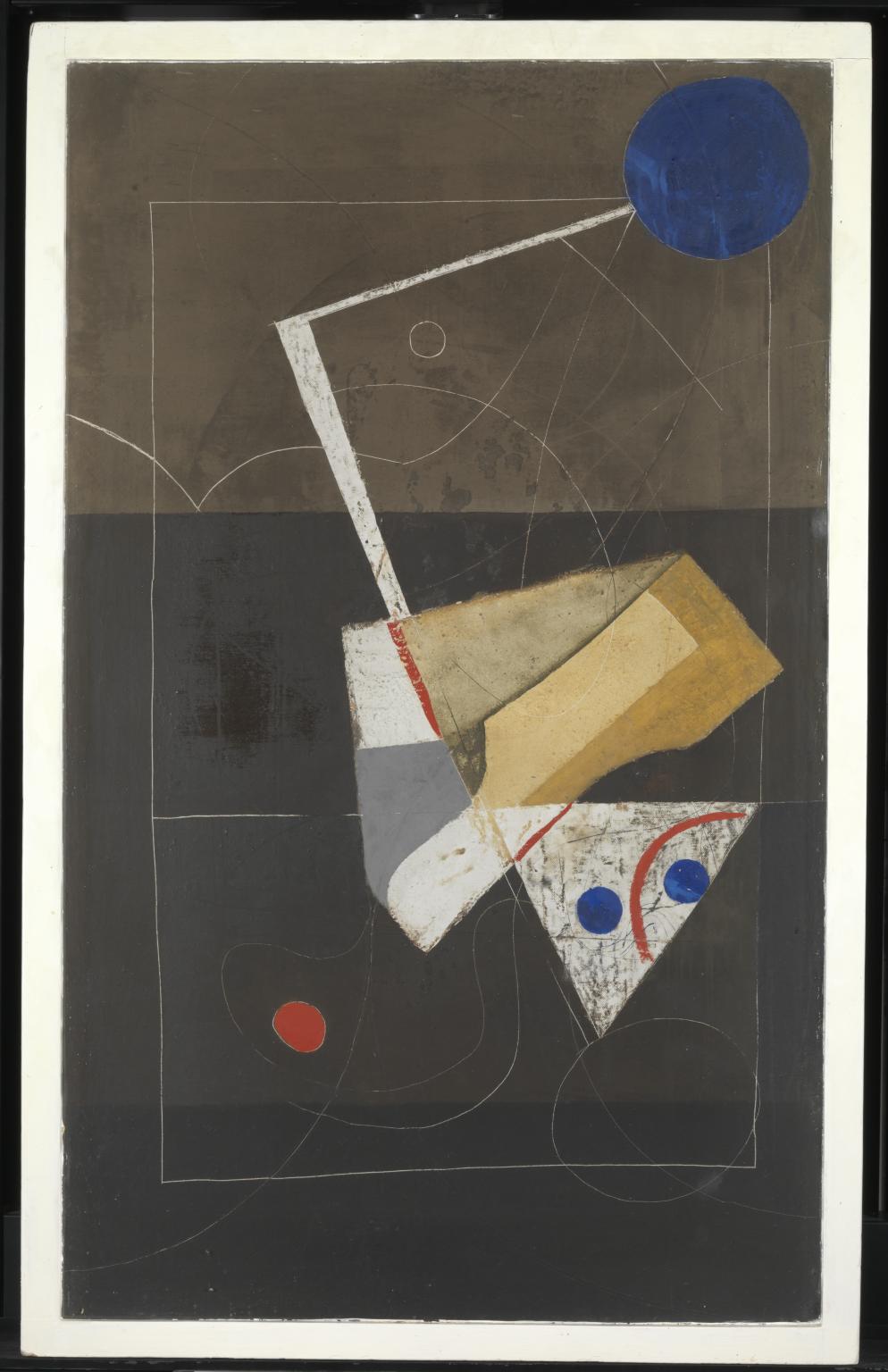 1933 (milk and plain chocolate) is a large portrait-format painting in which circles, triangles and other forms float in the non-perspectival space of the two-tone brown ground which gives the work its subtitle. A sense of movement is created by the contrasting use of bright blue and red dots and the scored white lines which join the different elements in the composition. Unlike some of Nicholson’s other paintings from the same year (see, for example, 1933 [guitar] [Tate N05125 ] and Jan 27 1933 [Tate T07595 ]) which show the influence of Georges Braque (1882–1963) and follow the palette of early cubism, 1933 (milk and plain chocolate) reflected Nicholson’s more recent experiences in Paris where, as noted by the art historian Charles Harrison, ‘the work of [Alexander] Calder, [Jean] Arp and particularly [Joan] Mir ó provided a stimulus unlike any he had previously encountered’ (Harrison 1969, p.26). Harrison also related the circle forms in such works as 1933 (milk and plain chocolate) to Nicholson’s ‘aptitude and enthusiasm for ball games’ (ibid.). Along with comparable works made in the same year, such as 1933 (hibiscus) and 1933 (painting) which feature a similar palette and the scored lines, 1933 (milk and plain chocolate) precedes the artist’s relief works such as 1933 (6 circles) as well as later, more geometric compositions such as 1945 (composition) and 1945 (two circles) . In 1932 Nicholson had begun sharing a studio with the sculptor Barbara Hepworth (1903–1975) and the years 1932–4, and the works both artists produced during this time, are characterised by their close working and personal relationship. Shared motifs or techniques include the use of dots or circles (Lewison 1993, p.214); while for Nicholson Hepworth’s influence is visible in the lines etched into the gesso of works such as 1933 (milk and plain chocolate) that would develop into the three-dimensional, sculptural approach taken in his white relief series of paintings, such as 1934 (relief) 1934 [Tate T02314 ]. 1933 (milk and plain chocolate) was exhibited in the inaugural Unit One exhibition at the Mayor Gallery in London in 1934, which was organised by the artist Paul Nash and subsequently toured. This exhibition was the first showing of paintings and sculpture by a group of British artists explicitly dedicated to the modernist principles of abstraction or surrealism and works such as this provided the first glimpse of this type of modernist painting for many in Britain. The reception was often critical, however; writing about the exhibition Jan Gordon of the Observer , for instance, stated, ‘I cannot explain the title of this group of artists, sculptors and architects, for there appears to be little obvious unity or oneness about them’ and, of Nicholson’s work specifically, ‘imagination seems to have become little more than an unexciting ingenuity’ ( The Observer , 15 April 1934, p.16). Nevertheless, the exhibition has subsequently been recognised as a pivotal moment for the development of modern art in Britain, in which the works exhibited essentially introduced the way in which British artists were assimilating the varying styles, techniques and theories of continental painting and sculpture. Re-stagings of this group of works in 1978 at Portsmouth Museum and Art Gallery and in 1984 at the Mayor Gallery, London both included 1933 (milk and plain chocolate) .