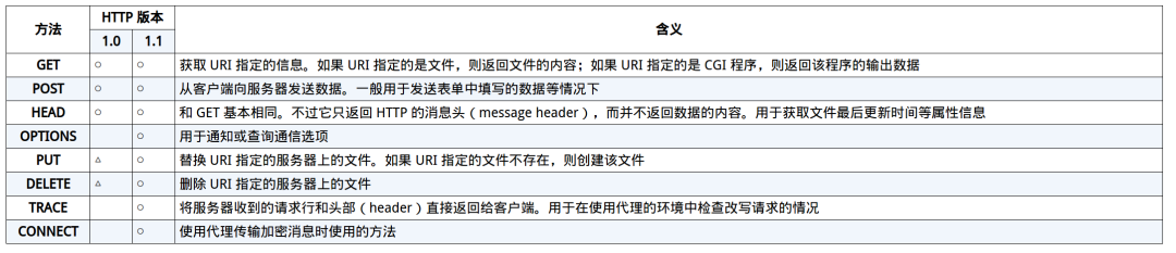 其中 "对什么" 的部分就是 URI (Uniform Resource Identifier,统一资源标识符),一般就是网页或者文件或者程序等,而 "进行怎样的操作" 的部分称为方法,包括: