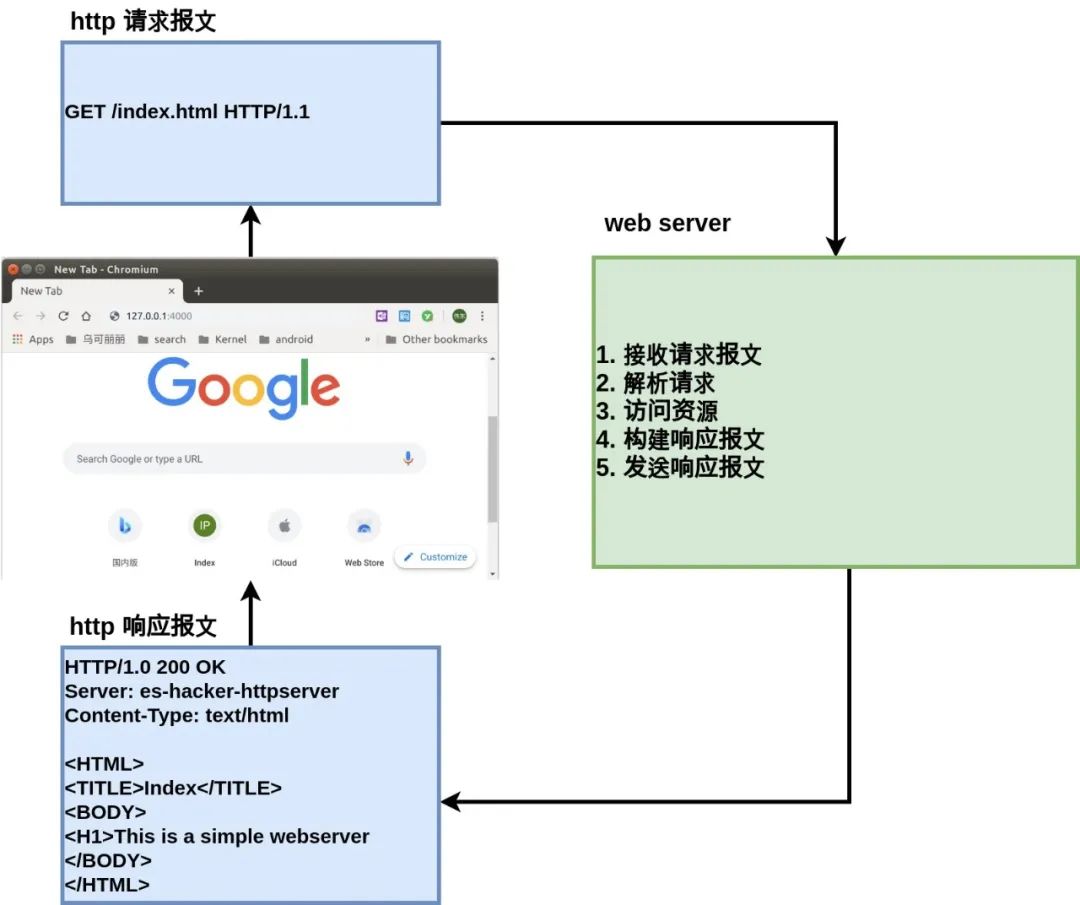 建立连接——接受一个客户端连接; 接收请求——从网络中读取一条 http 请求报文; 处理请求——对请求报文进行解析; 访问资源——访问报文中指定的资源; 构建响应——创建带有正确首部的 http 响应报文; 发送响应——将响应回送给客户端;