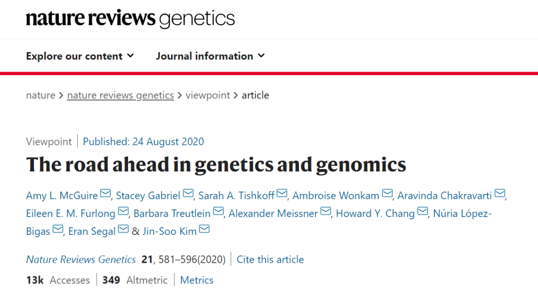 The road ahead in genetics and genomics.Amy L. McGuire, Stacey Gabriel, Sarah A.Tishkoff, Ambroise Wonkam, Aravinda Chakravarti, Eileen E. M. Furlong , Barbara Treutlein, Alexander Meissner, Howard Y. Chang, Núria López-Bigas,Eran Segal and Jin-Soo Kim,2020,Nature Reviews Genetcis