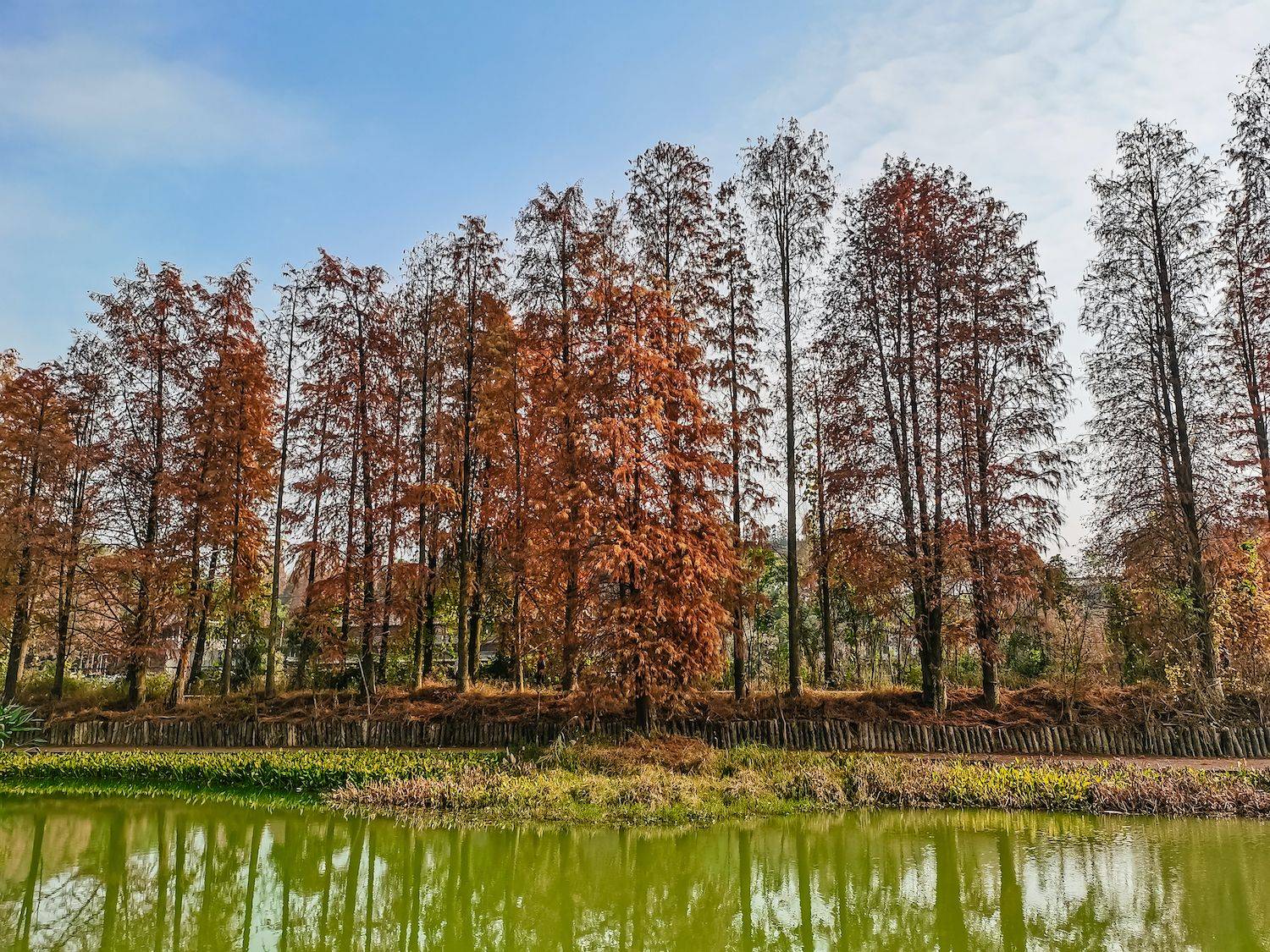 临安青山湖最好的游览的方式就是游船,湖中的这些红杉都像是在燃烧一般,在周边缓缓泛舟而行。如同彩色的油彩画一般美丽,鸟语花香,叫人沉迷其中不可自拔。