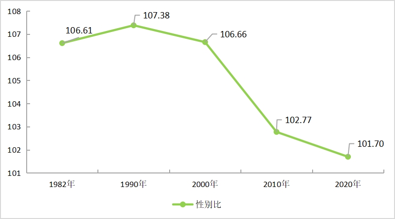 全市常住人口[2]中,男性人口为2144993人,占50.42%;女性人口为2109156人,占49.58%。人口性别比(以女性为100,男性对女性的比例)由2010年第六次全国人口普查的102.77下降为101.70。