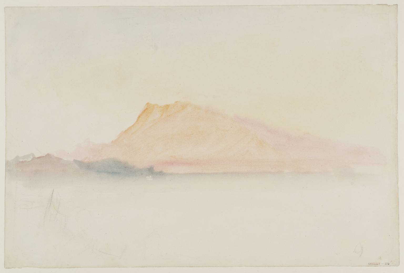 Turner visited Lucerne on all his Swiss tours of the 1840s, usually staying at an inn called Le Cygne, 'the Swan', on the shore of the lake. From here he could look across the water to one of the most famous mountains in Switzerland, the Rigi. He was captivated by its apparently changing colours under different conditions of light, and by the gentle mists which often surround it. Turner made many watercolour studies of it. They usually show the Rigi at sunrise or sunset when the mountain is at its most magical, and when he could explore the dramatic sky effects and reflections on the lake. The 1842 set of finished watercolours included no fewer than three views of the Rigi, based on studies made at the same time as the exhibited drawing .