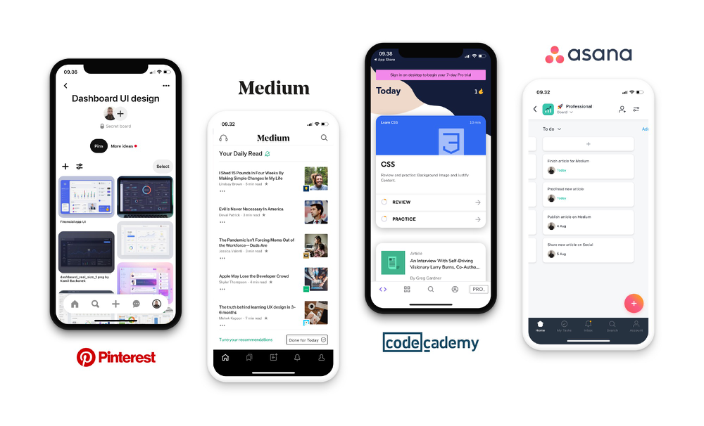 Screenshots from Pinterest最佳产品设计原则的 4 个特点 更详细的内容我在 《设计原则指南》 中也提到过。 产品设计原则的最佳案例 如果你想从 Asana、Codecademy、Medium、Pinterest 等优秀的产品中获得灵感,请继续往下看。