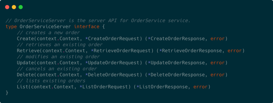 下面是上述介绍的一个示例,在这个例子中,我们首先定义了一个 gRPC 服务,使用 protobuf 规范以面向实体的方式操作 orders。使用 order 作为实体,我们需要定义该实体能够支持的服务,即与 CRUD 操作相对应的 RPC 方法。我们将添加一个额外的 RPC 方法 List,以支持列出 / 过滤现有的订单。
