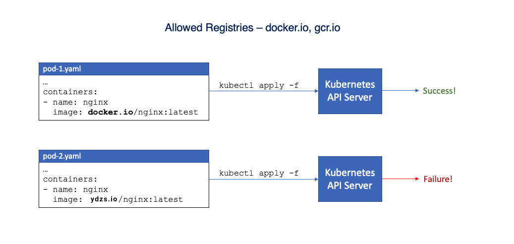 比如我们这里只允许使用来自 docker.io 或者 gcr.io 镜像仓库的镜像创建 Pod,其他不受信任的镜像创建的 Pod 将会被拒绝。