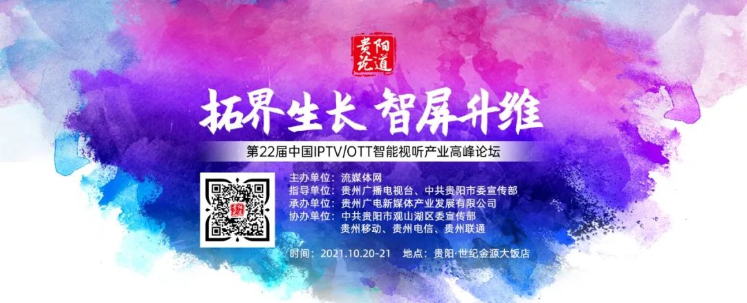 2021年10月20-21日,由贵州广播电视台、中共贵阳市委宣传部指导,流媒体网主办,贵州广电新媒体产业发展有限公司承办,中共贵阳市观山湖区委宣传部、贵州移动、贵州电信、贵州联通协办的第22届论道暨中国IPTV/OTT智能视听产业高峰论坛在贵阳隆重举行。本届论道以“拓界生长智屏升维”为主题,吸引了来自产业链各方核心人员。