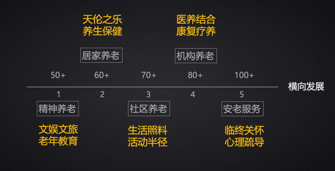 很多人都讲,中老年人就是从50岁左右,一直到80岁。以十年作为一个阶段来讲的话,在每一个年龄阶段他们的追求和诉求是不一样的。比如50岁刚退休的时候他们是自由的时候,所以他们追求精神养老,而在这个当中更大的市场需求是文娱、文旅和老年教育。60岁左右他们更多享受的是居家养老,更希望子女和孙子陪伴在身边,他们开始注重养生和保养。到70岁之后,开始享受社区养老的福利,他们更多需要的是家政服务和上门料理的内容,追求活动半径是越近越好。80岁不再关心哪里好吃或者怎么样,更多进入到机构养老当中,开始了医养结合和慢性疾病为主的康复治疗。到更高龄的阶段是一个安老服务,希望他们人生最后一段能够坦然的面对生命。