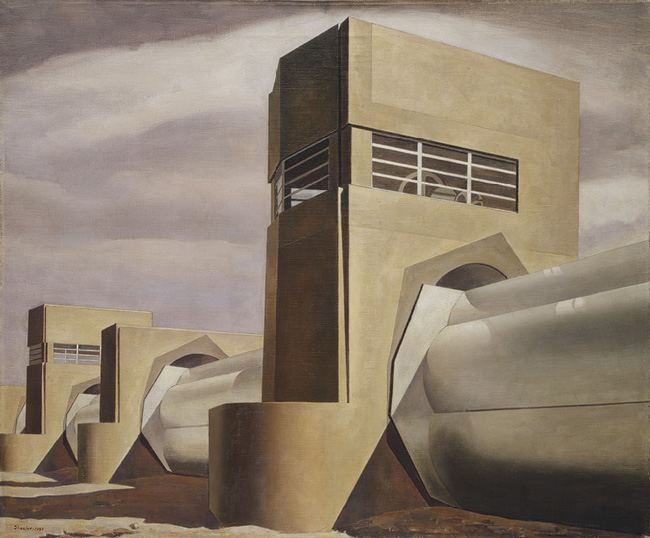 Water depicts one of the power generators built by the Tennessee Valley Authority in the 1930s, when hydroelectric power was being distributed throughout the Tennessee River region of the United States. Sheeler's experience as a photographer influenced his Precisionist style of painting, in which he emphasized the geometric shapes of objects in a hard-edged, clearly lit manner. For Sheeler, these monumental, streamlined forms signified human ingenuity in harnessing nature's power. His interpretation of American industry was somewhat idealized: workers are never shown, and the machinery is pristine and gleaming, free of any dirt or smoke. Sheeler expressed his feelings about the emotional symbolism of technology when he wrote: "Every age manifests itself by some external evidence. In a period such as ours when only a comparatively few individuals seem to be given to religion, some form other than the Gothic cathedral must be found. Industry concerns the greatest numbers—it may be true, as has been said, that our factories are our substitute for religious expression" (quoted in Constance Rourke, Charles Sheeler: Artist in the American Tradition, 1938).