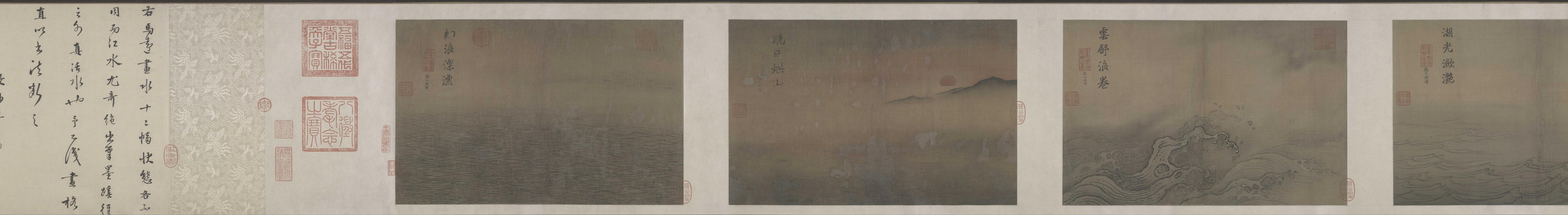 绢本,淡设色,每段长约26.8*41.6cm,共十二段,北京故宫博物院藏。此幅《山水卷》除了首幅只剩小半卷外,其它十一段均为整幅,而这十二幅皆全是水,但画家却画出了水的不同姿态,每幅图上据传有南宋宁宗皇后杨氏题写图名,分别为:寒塘清浅、洞庭风细、细浪漂漂、层波叠浪、云生苍海、黄河逆流、云舒浪卷、长江万顷、秋水廻波、湖光潋滟、晓日烘山,诗情画意之名与细腻澎湃之图结合营造出不同意境。