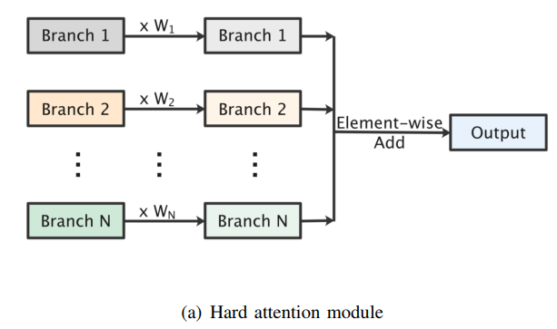 作为一种手工设计的权重,难以注意的是将不同阶段的输出赋予手工设计的权重。可以直接把每个分支的权重看作一个超参数。但是,当分支流的数量太大时,就会有太多的超参数。因此,很难得到最优组合。此外,在对模型进行多次训练之前无法知道对于一个特定的任务,模型应该集中在哪个阶段。也就是说,手工设置无法合理整合多个分支的特征信息。因此,更注重软注意力。