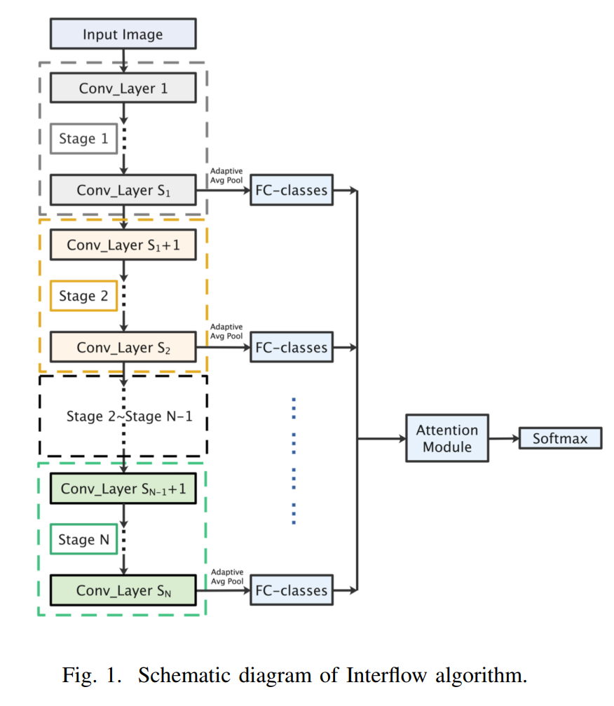 Interflow首先根据层次的深度将CNN划分为不同的阶段。对于每个阶段的最后一个卷积层,通过自适应平均池化,特征映射的大小减少到 。然后,得到的输出经过一个全连接层,得到该阶段不同类别的置信系数。