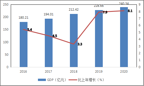 经济运行逆势向好。2020年全年累计实现地区生产总值240.34亿元,按可比价格计算,比上年增长8.1%,其中,第一产业实现增加值34.87亿元,增长4.6%;第二产业实现增加值112.25亿元,增长10.8%;第三产业实现增加值93.23亿元,增长5.6%,三次产业结构为14.5:46.7:38.8。