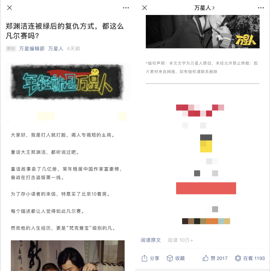 酱说:文章以童话大王郑渊洁的童年轶事引入,讲述了郑渊洁时刻“凡尔赛”的洒脱人生,思想的高度令人敬佩,该账号平时阅读量8W+,在看数为100上下,这篇是其近期最高的一篇。