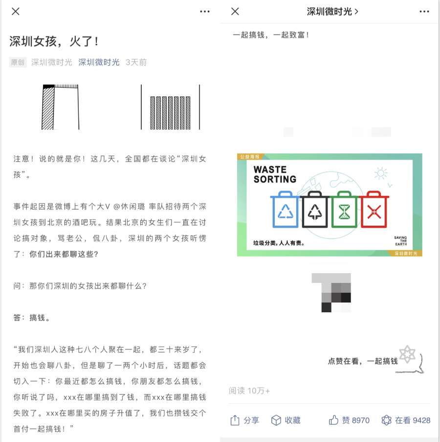酱说:文章讲述了深圳女孩努力工作赚钱的生活态度,积极向上学习晋升的生活方式引发大量用户共鸣,同时引起评论区对该现象的热烈讨论。该账号平时阅读量为2W+,这篇阅读量破200W,在看数近万,属于其账号爆款。