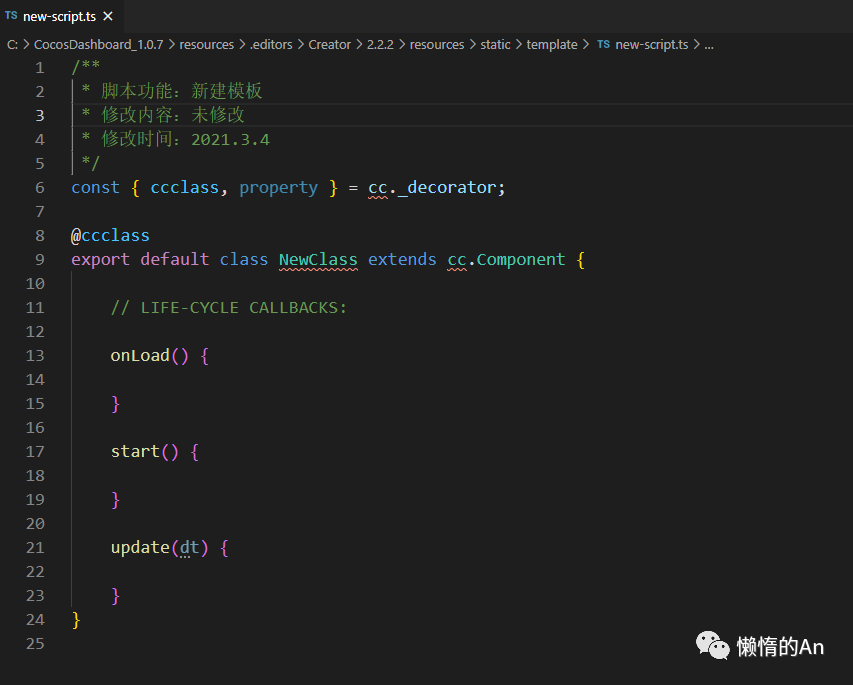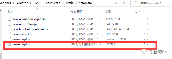 在 template 文件夹中找到 new-scripts.ts,并用编译器打开它,如果想修改 js 模板就打开 new-scripts.js 来修改: