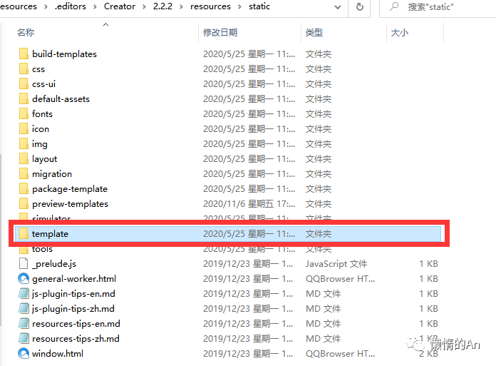点击之后会弹出 Cocos 安装目录的 resource 文件夹,双击打开 static 文件夹: