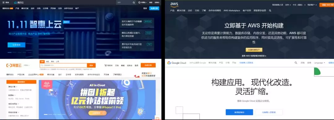对比国内外几个云厂商的首页,其实问题还挺明显的。首页就是门面,代表了你的形象,代表了你想传递什么信息给客户。