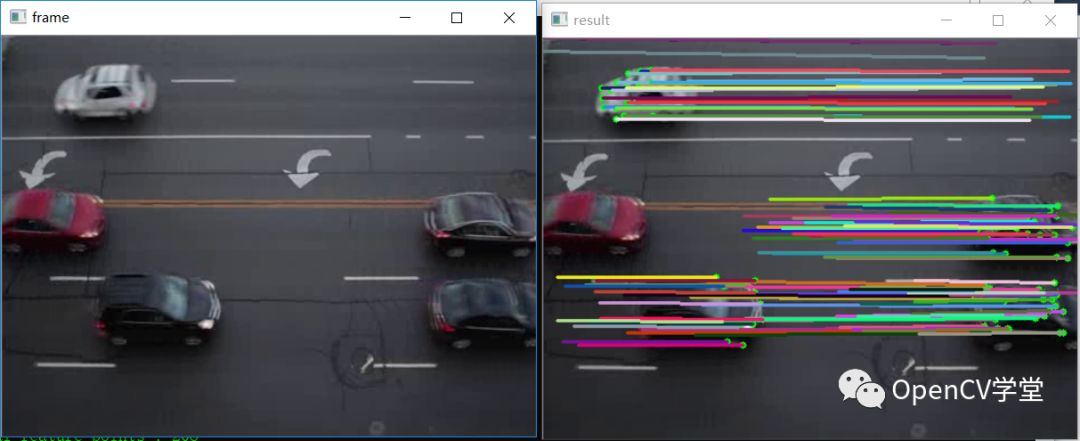 }左侧是视频的原始每一帧、右侧视频是每一帧中KLT算法实时轨迹绘制