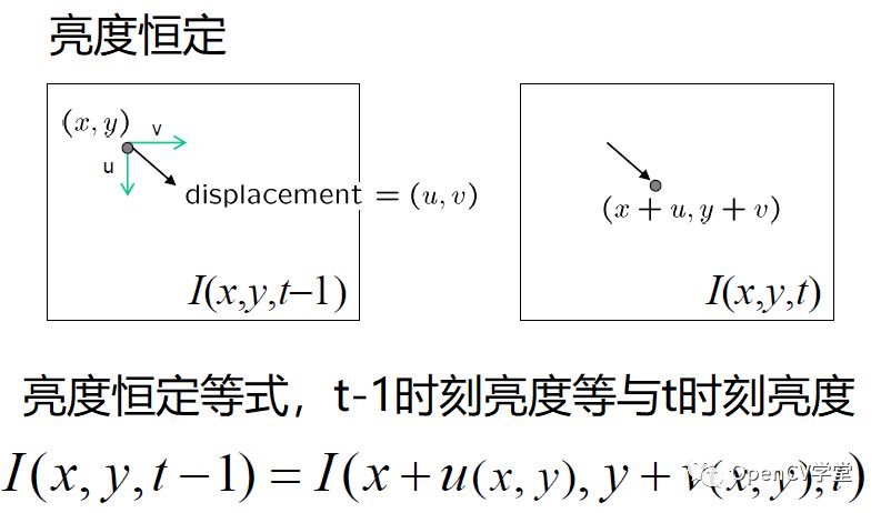 对象中任意像素点p(x,y)亮度值,在t-1时候的值,在t时刻移动(u, v)之后亮度值保持不变