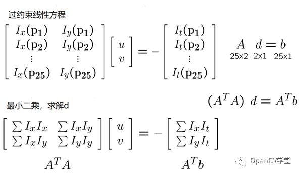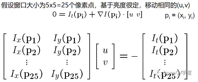 假设对像素点p(x, y)来说,周围的像素点都保持相同的移动距离(u, v) 假设窗口大小为5x5,则对于25个窗口内的像素点来说,就会如下等式成立:
