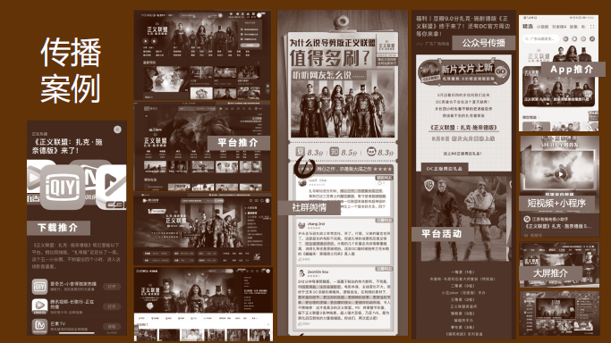 在影片整个宣传推广中,不仅捷成华视网聚进行全网的传播,各个媒体平台也利用自身渠道资源进行有效推广,包括开机启动页面、各个频道首页等,华为也单独为《正义联盟》选择了1900家线下店不间断地播放预告片,这从侧面证明该影片在业内引起积极响应,18家媒体的联合参与也一定程度上反映出对“数字院线”模式的认可。