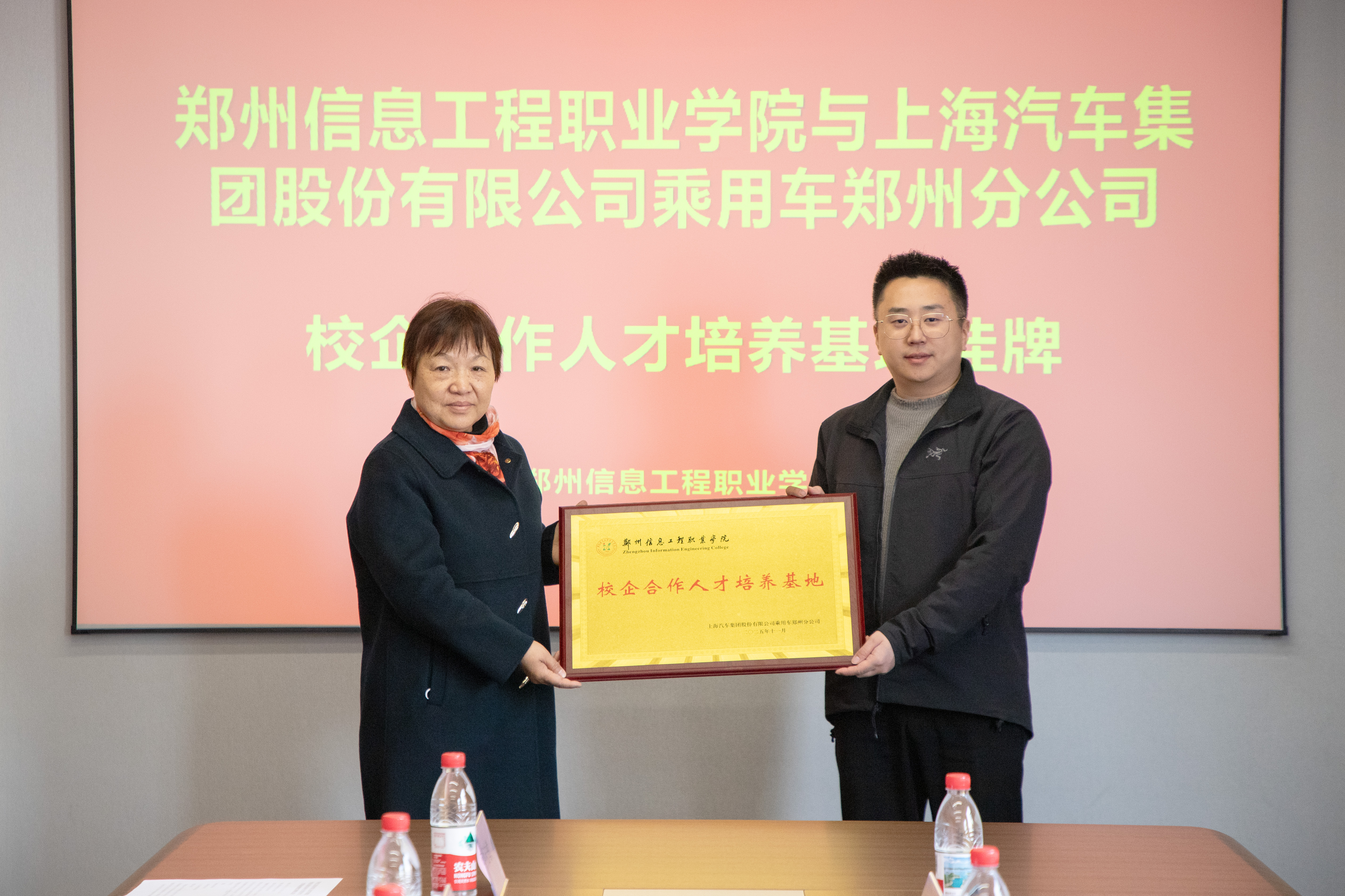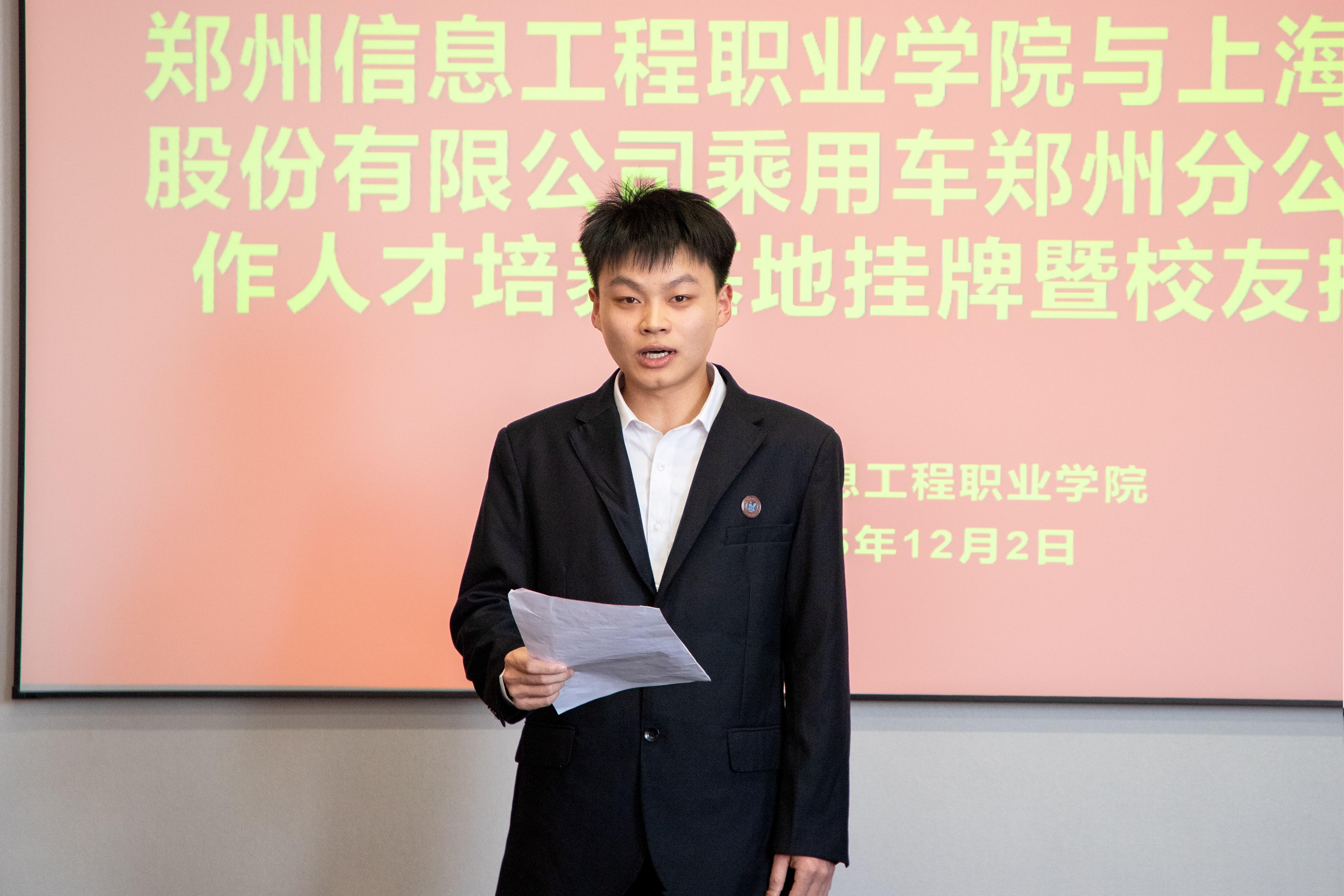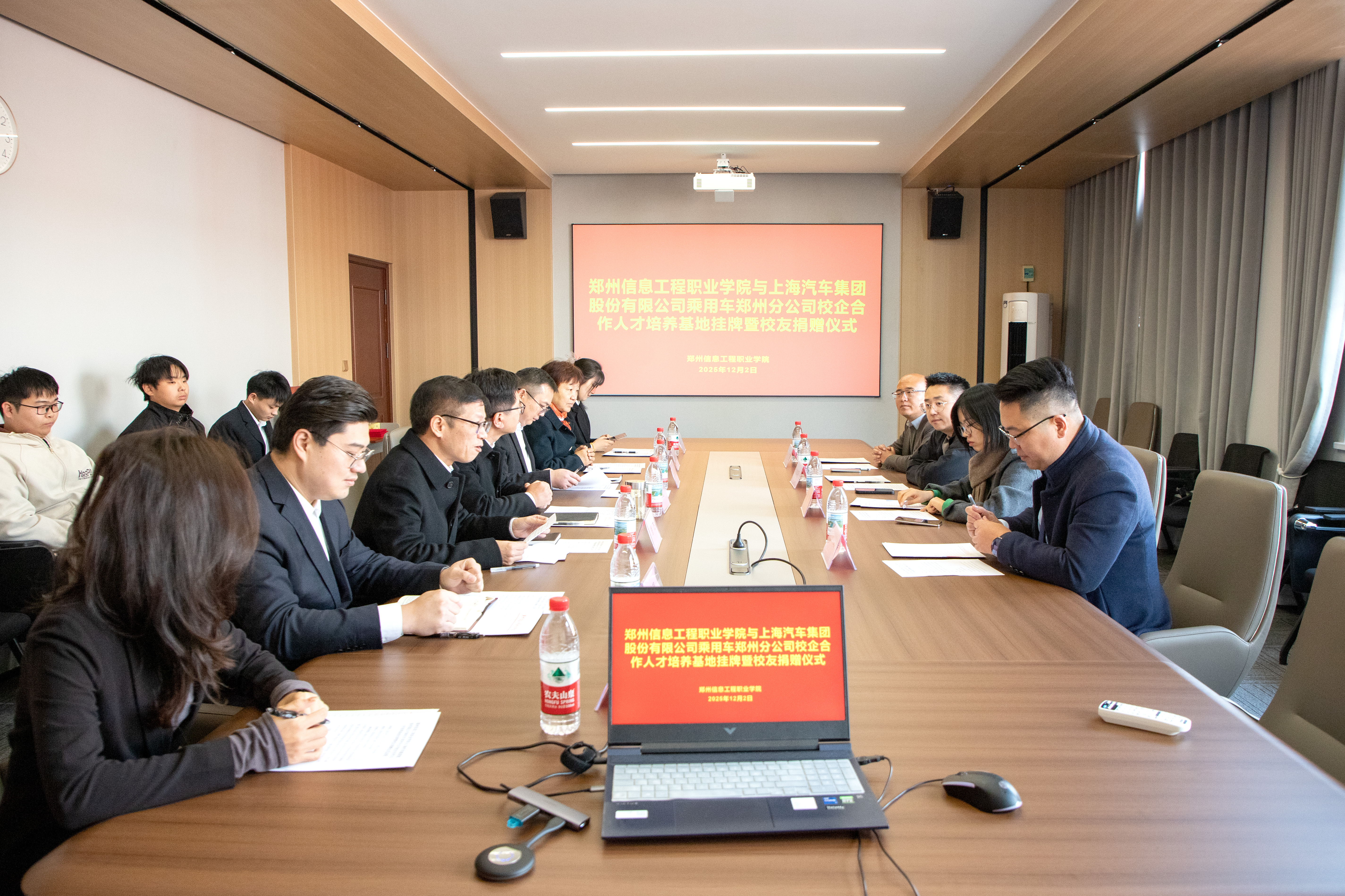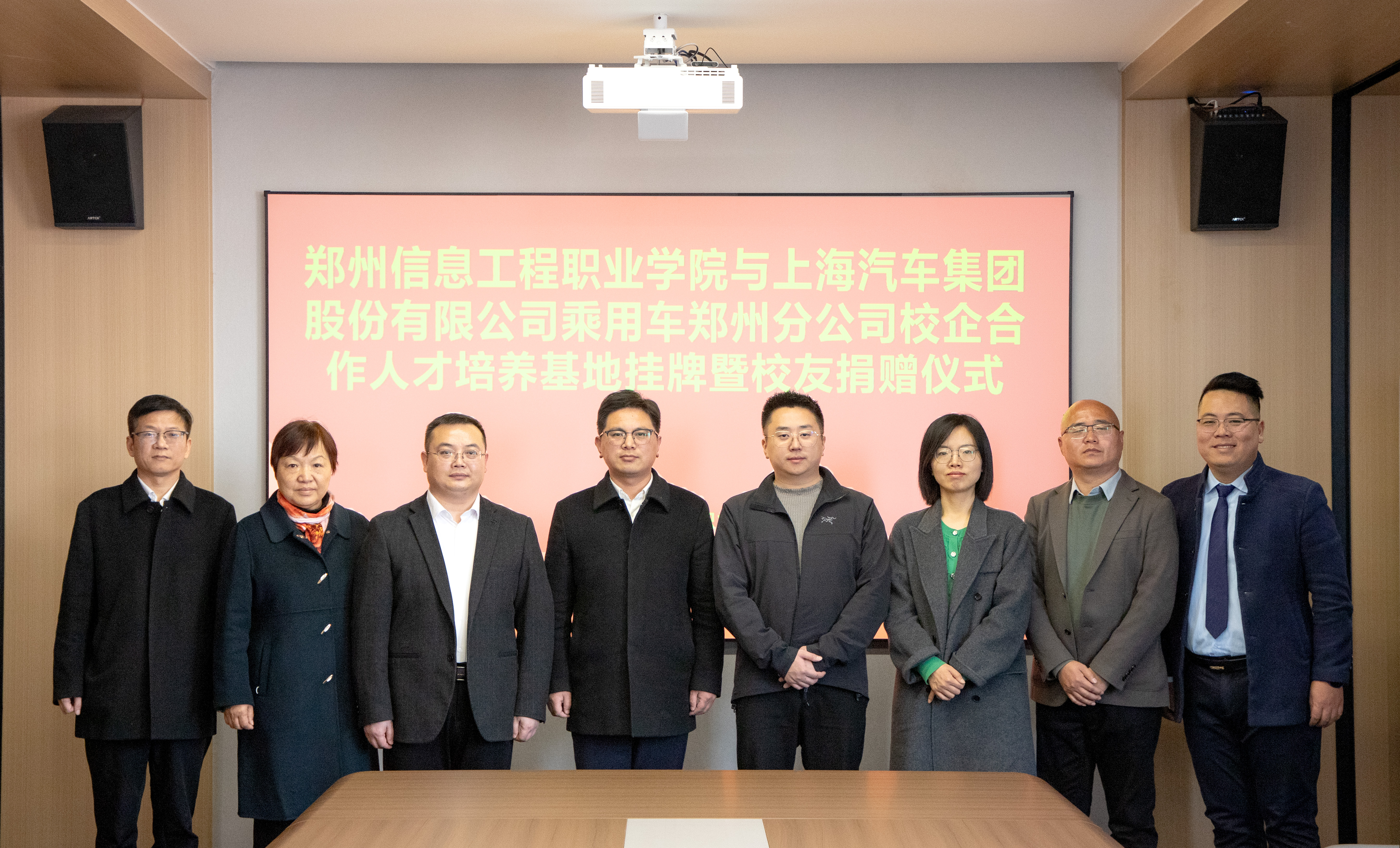 12月2日,郑州信息工程职业学院与上海汽车集团乘用车郑州分公司校企合作人才培养基地挂牌暨校友捐赠仪式在南校区举行。上汽集团人事经理施宏超,招聘主管张丹,人事主管郑信2004届校友李凯;校党委副书记、校友会秘书长王伟超,副校长步首志,就业创业办公室主任徐杰,智能制造学院党总支书记、院长魏增菊,郑信郑州校友会秘书长王保芳及相关老师和实习生代表参加活动,共同见证校企协同育人的新起点和校友深情反哺的温暖时刻。仪式由徐杰主持。