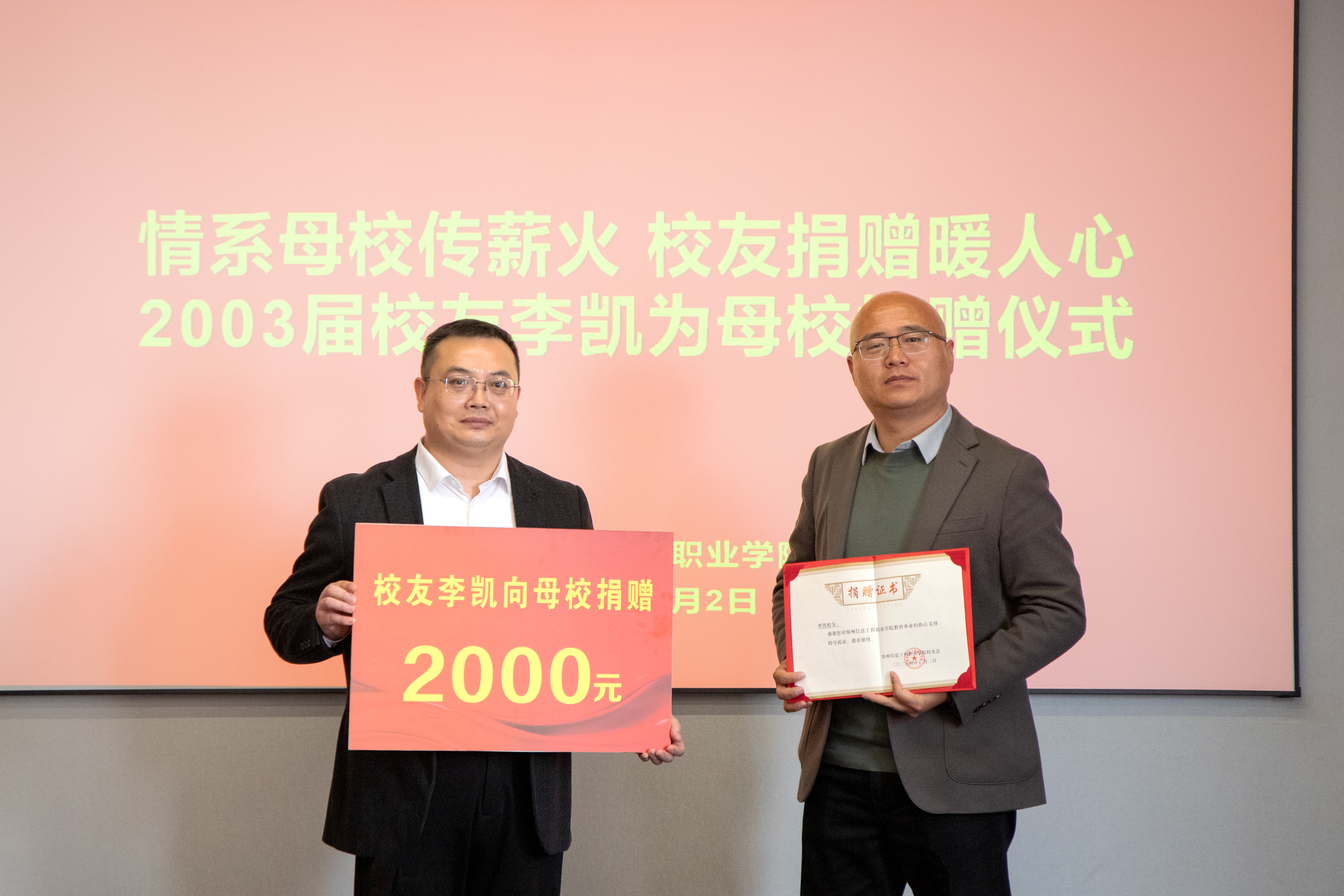 捐赠仪式中,李凯校友以个人名义向母校捐赠资金,用于学生发展与校友工作。王伟超秘书长代表学校接受捐赠并颁发证书。
