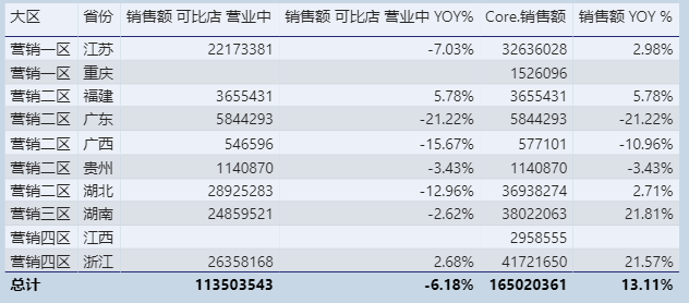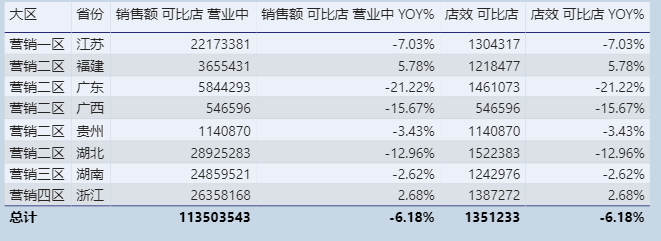 通过横向比较各省份店效,可以看出,湖北省可比店店效最高,广西省最低。但从同比角度来看,增长最高的是福建省5.78%,增长最低的是广东省,下跌21.22%。