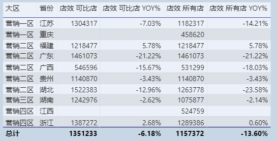 分析完同期数据,可能还要进一步对各部门各省份进行横向比较,由于每个部门规模不同,就要通过店均营业额来统一规模口径,这又引入了店效的概念: