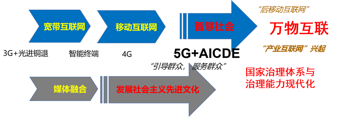 如上图所示,过去十多年,TMT产业已经经历了宽带互联网(光进铜退)、移动互联网(3G+4G)并正在向“智慧社会”(5G+AICDE)时代演进。但广电行业在20世纪完成从黑白到彩色的转变之后,在21世纪头二十年的数字化进程中乏善可陈,难以进一步向IP化、云化、融合化与智慧化阶段推进。尤其是广电行业未能通过广泛而多层次的电视服务培养出大众用户的付费电视消费习惯,无法基于市场本身动力推进“全国一张网”,也难以自发自主推动高清化潮流,以及进一步的业态模式变革(参考《泛言广电国网与中移动5G合作:10年战略节奏之失?》与《劲语快评|反思中国电视数字化,专用教育终端再下一城!》)。在技术方面,广电行业曾经在NGB和CMMB存在战略性失误,加上在云计算、大数据等新技术应用方面的迟滞,导致其难以适应当下“万物互联”背景下泛媒体以及媒体边界消融的格局,传统电视媒体影响力一再下滑。