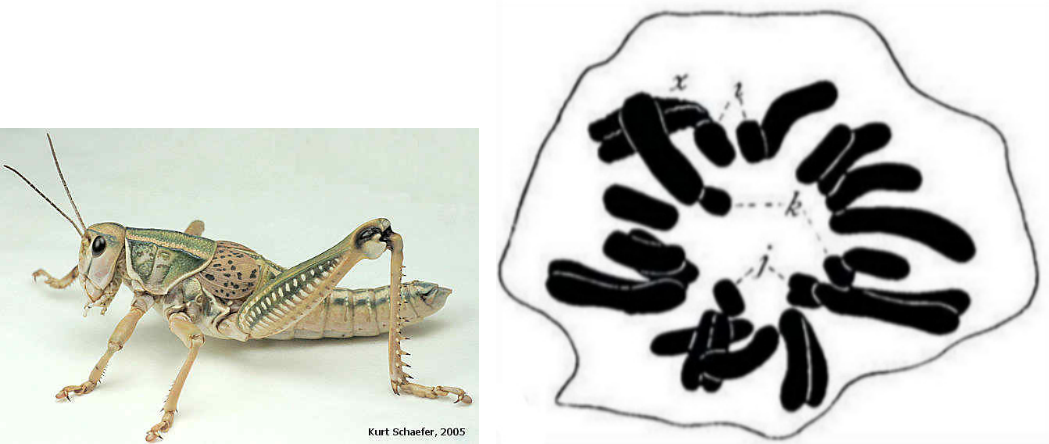 然而对于X染色体如何决定性别,麦克朗和萨顿一开始却搞错了。蝗虫的染色体虽然大,但是只有雄性蝗虫的输精管中产生精子的减数分裂过程较易观察,而蝗虫雌性减数分裂研究起来困难重重。因为减数分裂会停滞在第一次分裂前期,直到产卵后迅速完成分裂,而且当时还没有完善的制备雌性蝗虫减数分裂细胞的技术,成熟技术要到很多年后才发展出来。因此这一时期,研究人员很难观察到雌性蝗虫细胞分裂过程。这让萨顿在染色体数量统计上就犯了不小的错误。雌性蝗虫有24条染色体,萨顿数成了22条。这个后果算比较严重的,误导了他的导师麦克朗。因为他们之前已经数清楚了,雄性蝗虫是23条染色体(22+X),没有Y染色体,所以麦克朗推断,X染色体是决定雄性的。推断倒是合理,可惜萨顿的确数错了,对染色体决定性别的关系就彻底搞反了。