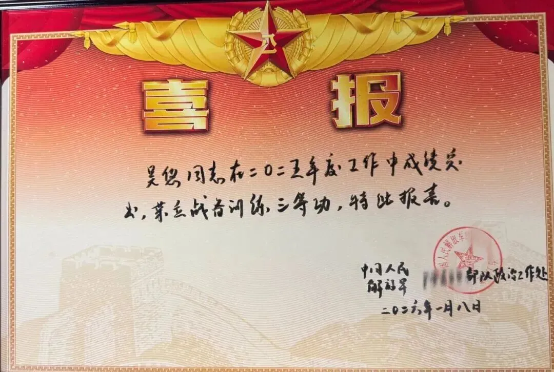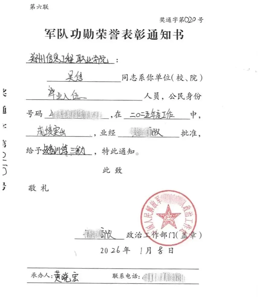 近日,一封来自部队的喜报跨越山海,飞抵母校校园——郑州信息工程职业学院2018级优秀校友吴悠同志,在服役期间表现突出,功绩显著,荣立个人三等功!