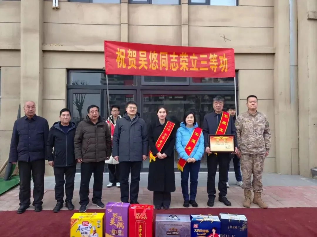 新乡市原阳县人武部部长一行专程来到吴悠家中,为其送上三等功喜报与慰问品,向吴悠及家人致以热烈祝贺与诚挚问候。
