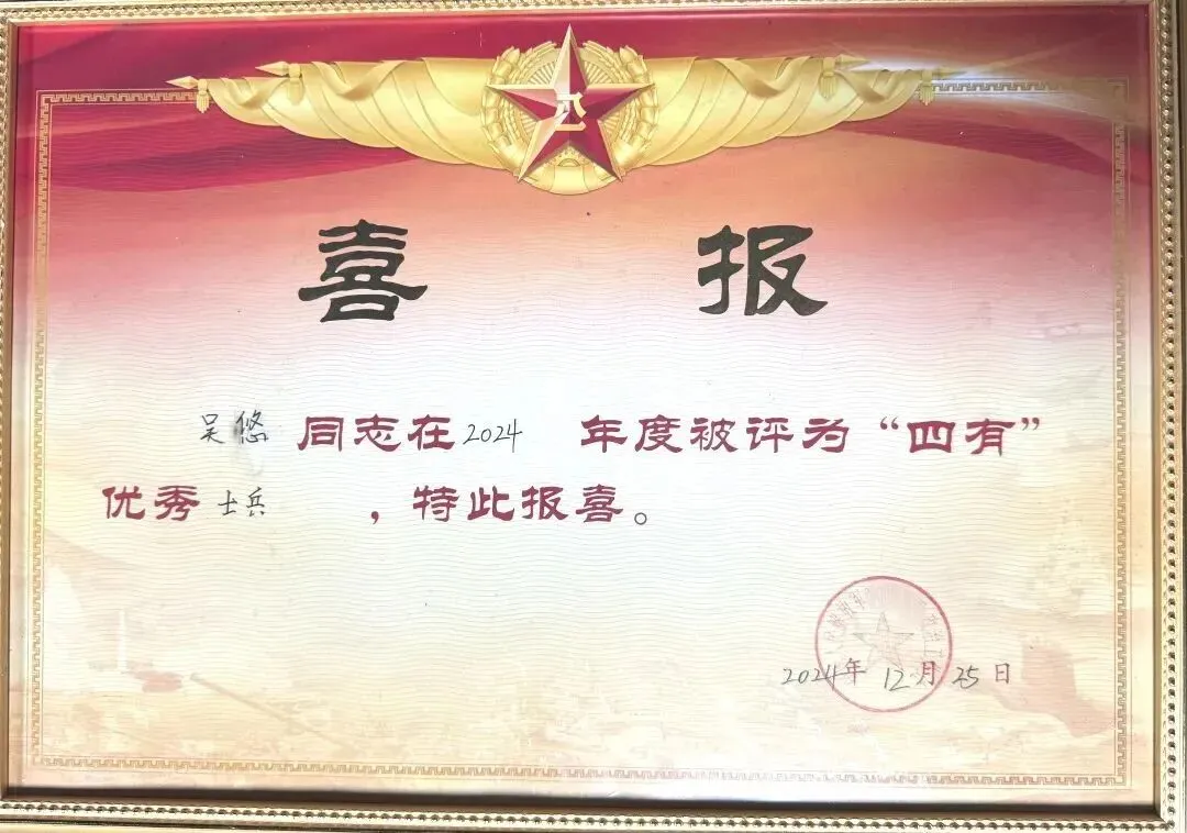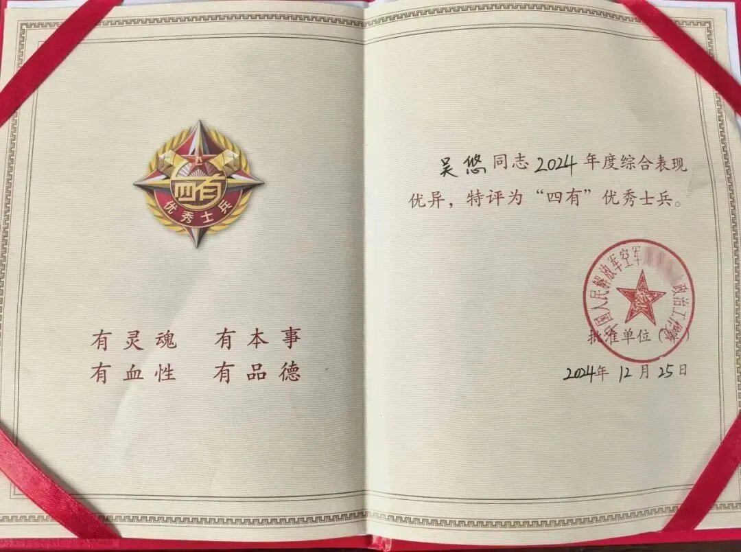 毕业后,面对人生的多重选择,吴悠积极响应祖国号召,毅然投身绿色军营,将个人的理想融入强国强军的伟大事业,用实际行动诠释了新时代青年的家国情怀与责任担当。