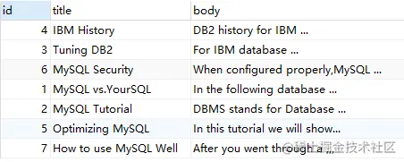 上述语句,查询的 'MySQL IBM' 没有 '+','-'的标识,代表 word 是可选的,如果出现,其相关性会更高