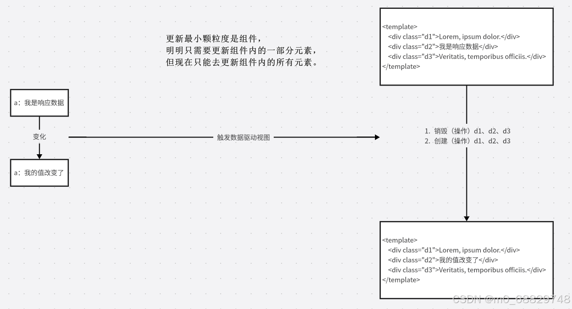在vue和react中,我们将大部分操作dom的事情交给了vue和react,从而使我们只需要关心操作数据即可。数据变化时,vue和react操作dom实现自动更新视图。每次更新视图的最小单位是组件。vue和react都使用了虚拟dom。
