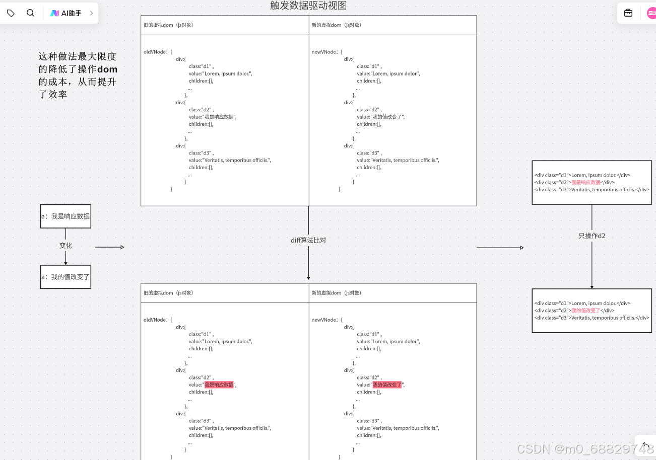 可以结合diff算法比较两个虚拟dom,从而找到这两个虚拟dom的相同点和不同点。