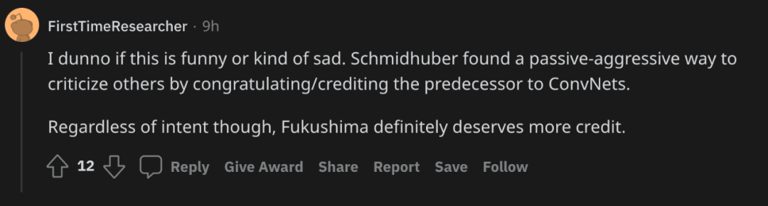 我不知道算是好笑还是悲伤。Schmidhuber 找到了一种被动攻击的方式,通过祝贺 / 赞扬卷积神经网络的先驱来批评他人。 不管意图如何,福岛绝对值得更多的赞誉。