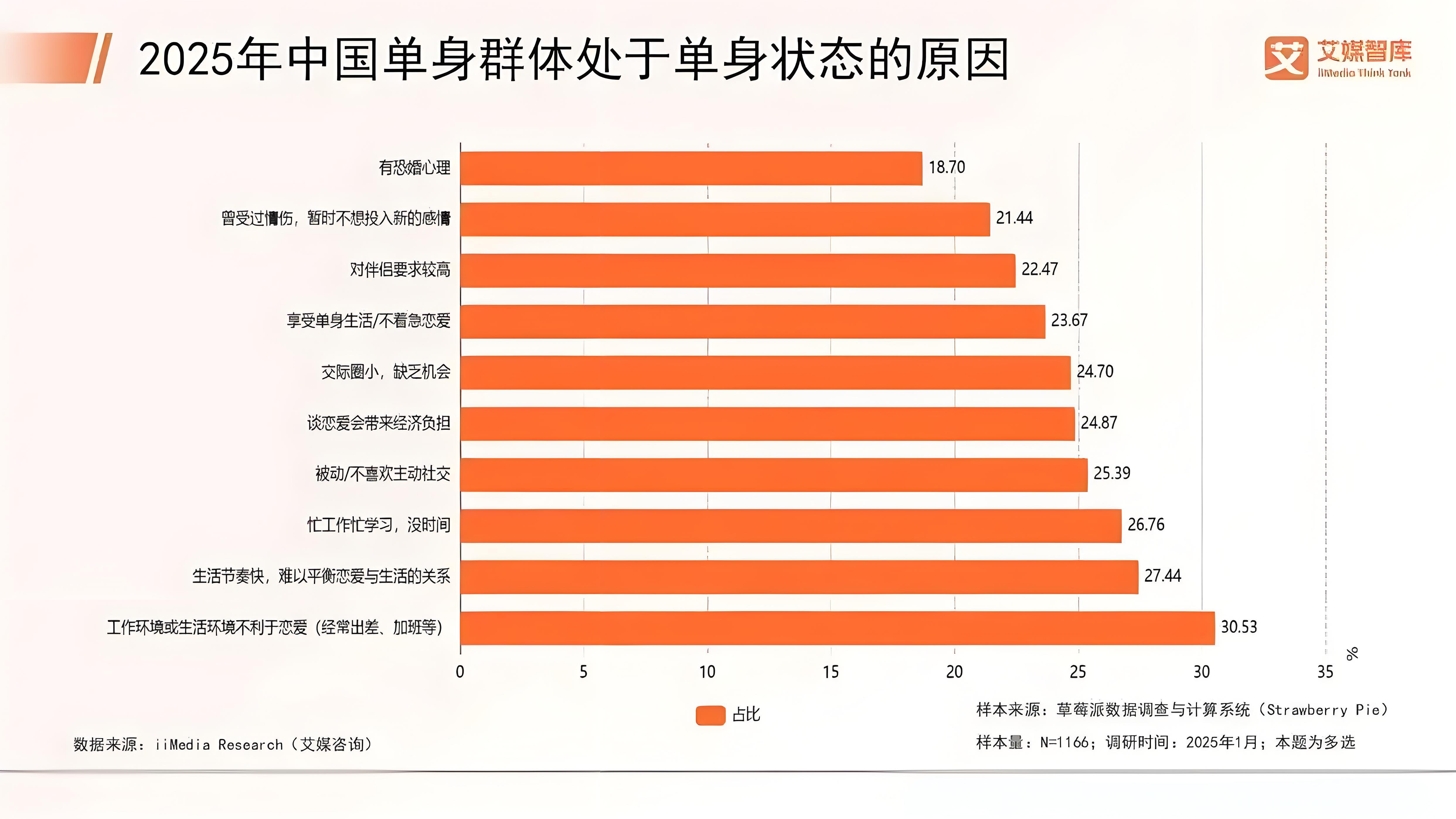 艾媒咨询曾做过一份关于《2025年中国单身群体处于单身状态的原因》的研究报告,数据显示,“工作环境或生活环境不利于恋爱(经常出差、加班等)”占比最高,达到30.53%,说明工作和环境因素是导致单身的主要原因。