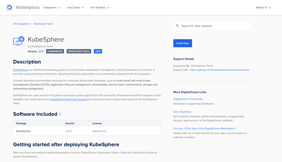 顺便提一句,DigitalOcean MarketPlace 已经上线了 KubeSphere 3.1.0[2],对 KubeSphere 感兴趣的小伙伴可以直接通过 DigitalOcean 一键部署啦。